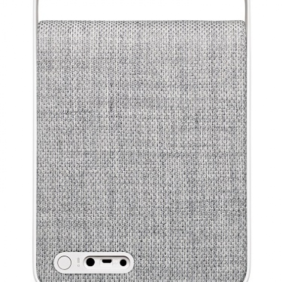 Ở mặt sau cũng là một bề mặt vải sợi nối liền với mặt trước, góc dưới bên trái một hốc nhỏ, nơi có cổng sạc điện, cổng 3.5mm và một nút tắt mở loa, kết nối bluetooth.